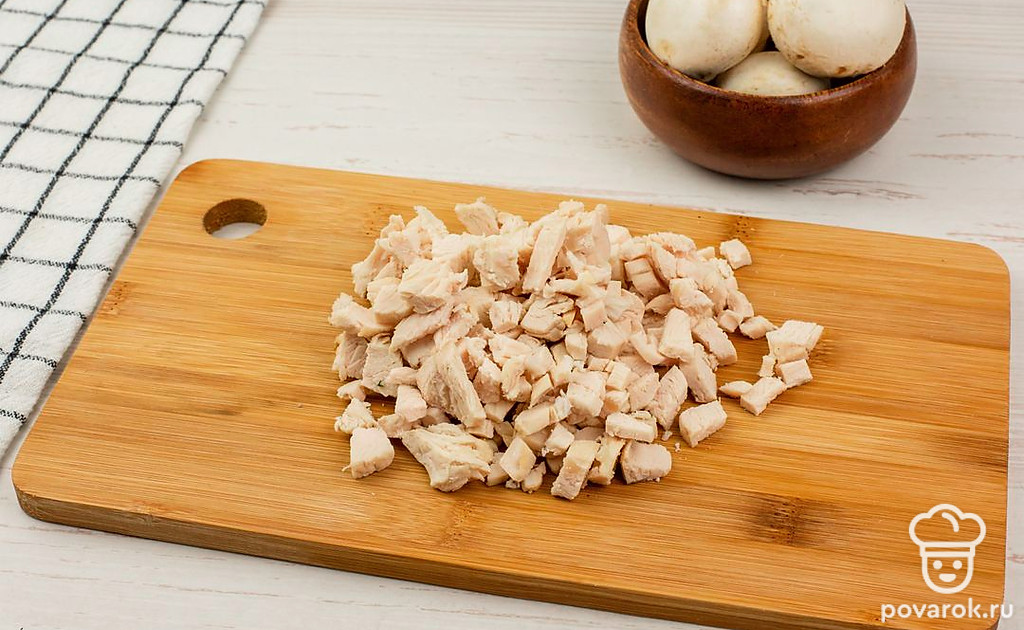 В небольшую кастрюлю положите куриное филе, залейте водой, доведите до кипения, посолите и варите до готовности. Затем остудите мясо и нарежьте его на небольшие куски.