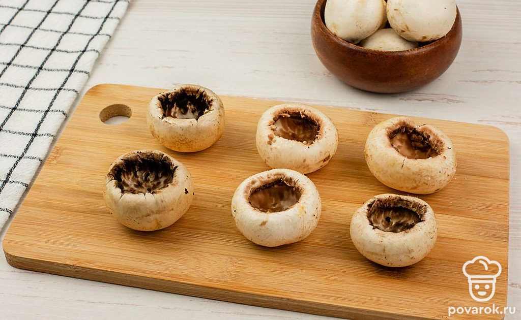 Шампиньоны очистите, затем аккуратно удалите ножки.