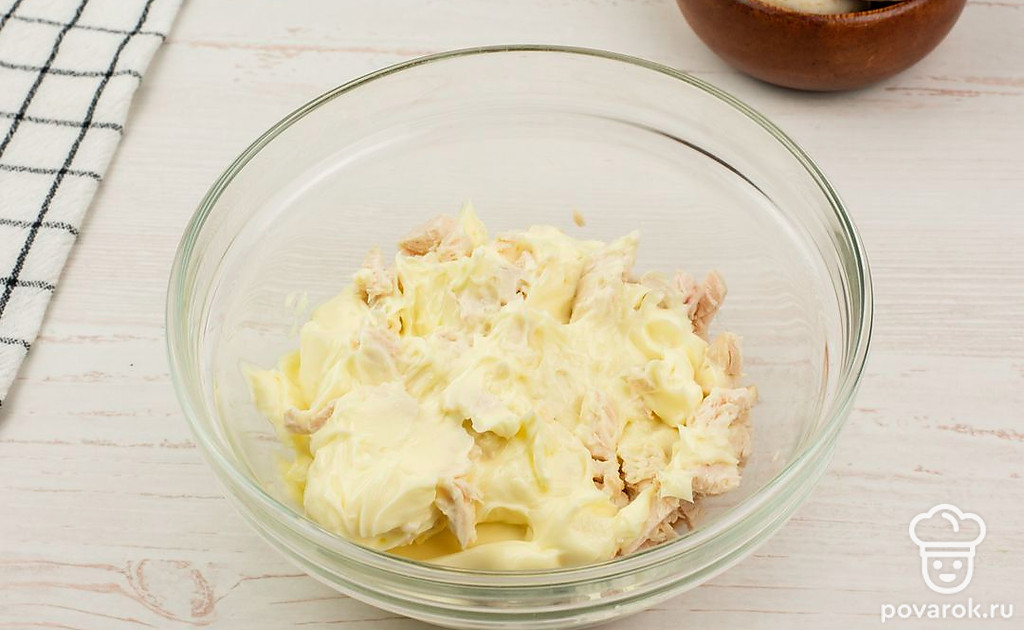 В глубокую тарелку добавьте сливочный сыр и курицу, посолите по вкусу и хорошо перемешайте.