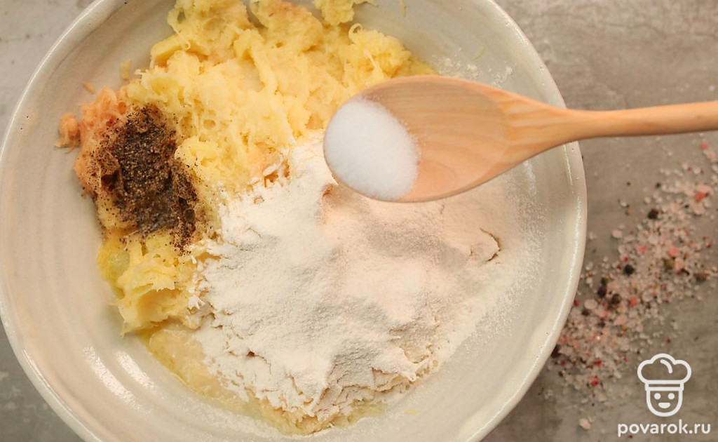 Мелко натрите лук и картофель, добавьте к ним соль, молотый перец и муку. Перемешайте массу и при необходимости аккуратно слейте сок.