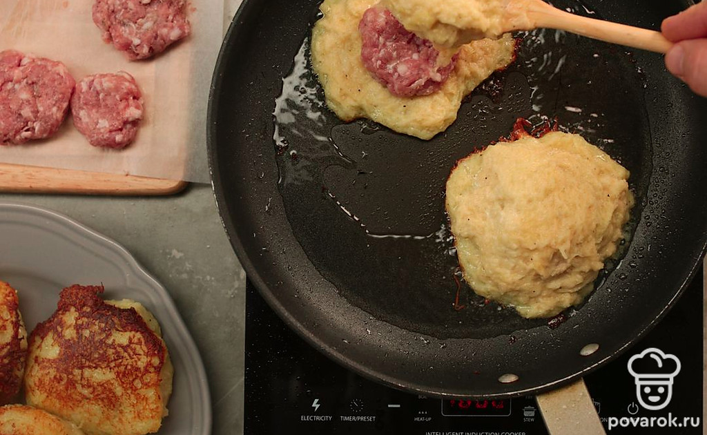 На разогретое масло выложите по 1 ст. л. картофельной массы, слегка придавите ложкой и разровняйте. На картофельные лепешки выложите по одной мясной котлете. На мясную начинку выложите еще по 1 ст. л. картофельной массы и снова разровняйте.