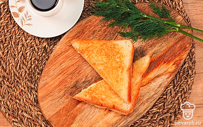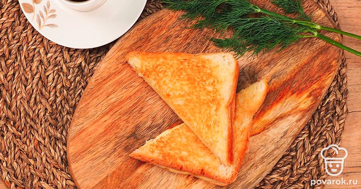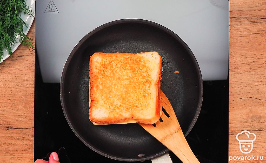 Прожарьте сэндвич на сковороде на умеренном огне до аппетитной корочки по 1,5-2 минуты с каждой стороны. За это время сырная начинка расплавится. Масла, которым вы смазали хлеб, достаточно для обжаривания, поэтому не стоит дополнительно смазывать сковороду, иначе сэндвичи получатся чересчур жирными.