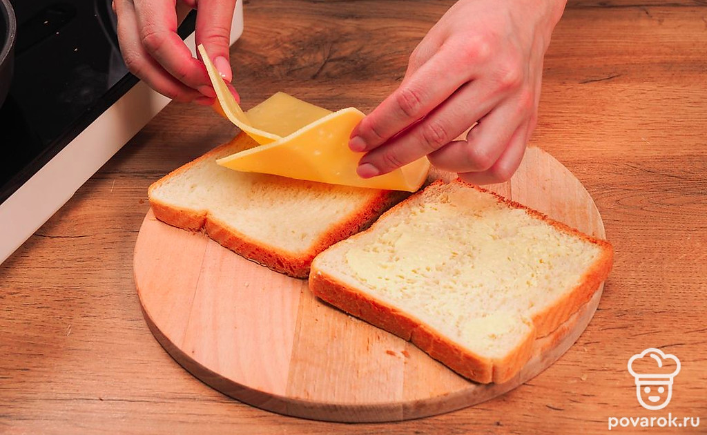 Выложите сыр (можно в 2 слоя) на один ломтик хлеба (на сторону, которую вы не смазали маслом). Другим ломтиком хлеба закройте сыр сверху (маслом наружу).