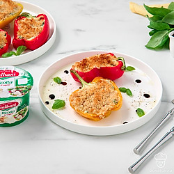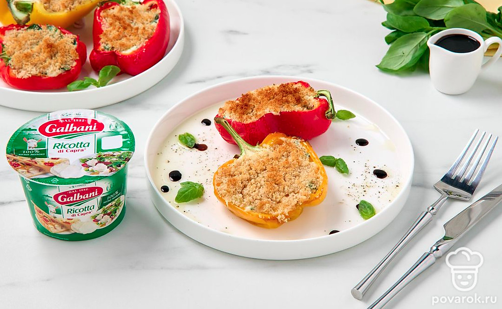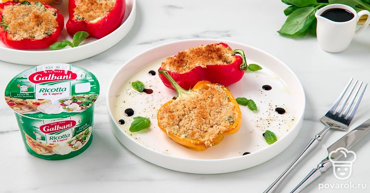 Традиционно фаршированные перцы готовят с мясом и рисом. Вместо них в этом рецепты мы использовали много сыра и пряные травы. Нежная козья рикотта Galbani при запекании приобретает нежную консистенцию, а специи и свежая зелень придают блюду пикантности. Подавайте перцы в горячем или холодном виде — как закуску или самостоятельное блюдо.