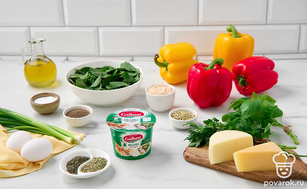 Вымойте шпинат, зеленый лук, базилик, петрушку и болгарский перец. Разрежьте перцы пополам, но уберите только семена и белые перегородки, а зеленую плодоножку не трогайте — она нужна для того, чтобы начинка не вытекла при запекании.