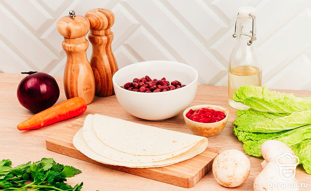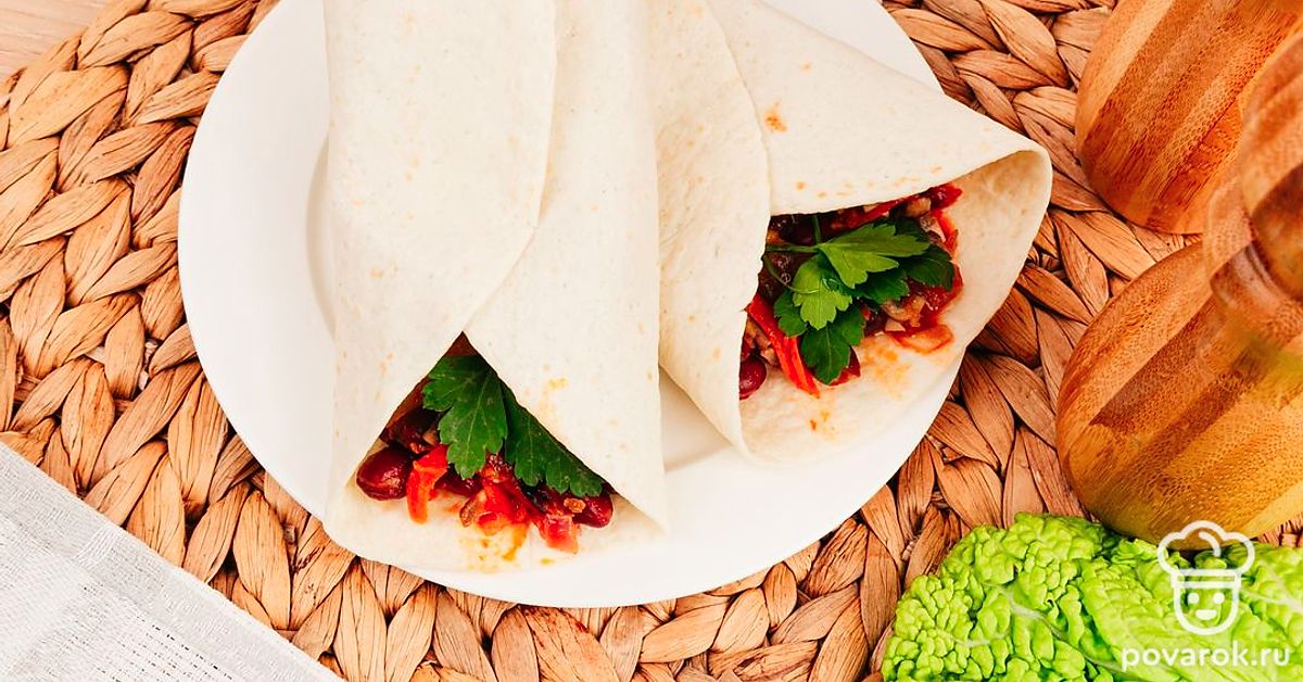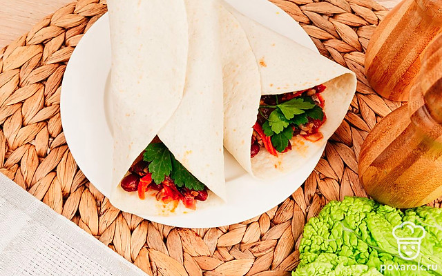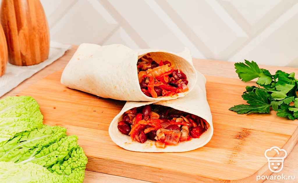 Буррито с фасолью — представитель мексиканской кухни. Это сытная комбинация из красной фасоли, хрустящей сочной пекинской капусты, пикантного красного лука с нежными шампиньонами. Отличный сытный и полезный перекус прямиком из Мексики.