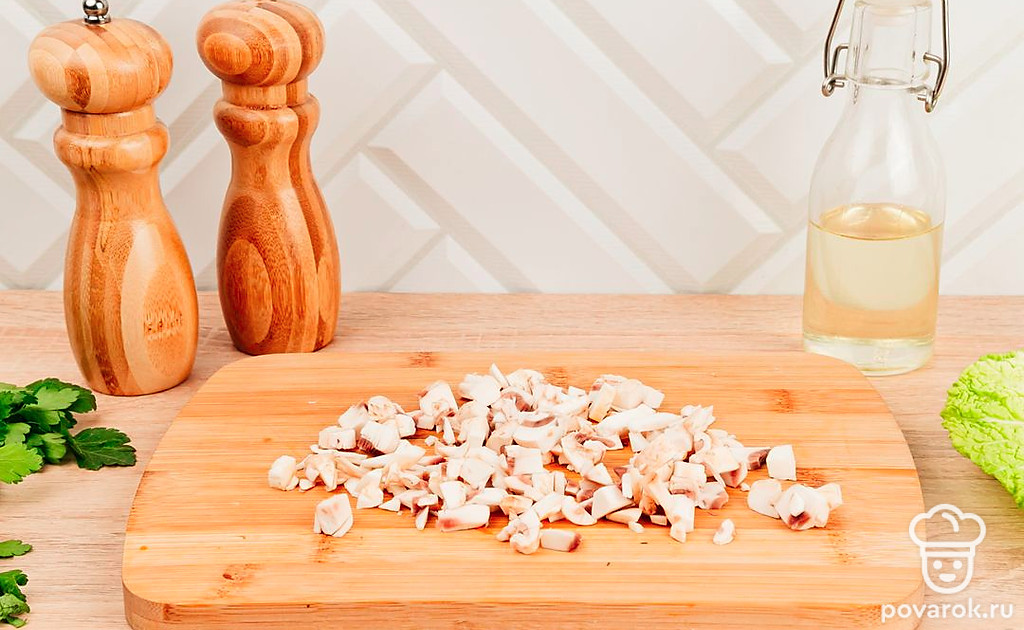 Красную фасоль слейте на дуршлаг и просушите бумажным полотенцем. Морковь помойте и очистите. Лук очистите. Пекинскую капусту и шампиньоны помойте и просушите бумажным полотенцем. Удалите верхний слой кожицы шляпки грибов, удалите все потемнения и обновите срез ножки гриба.
