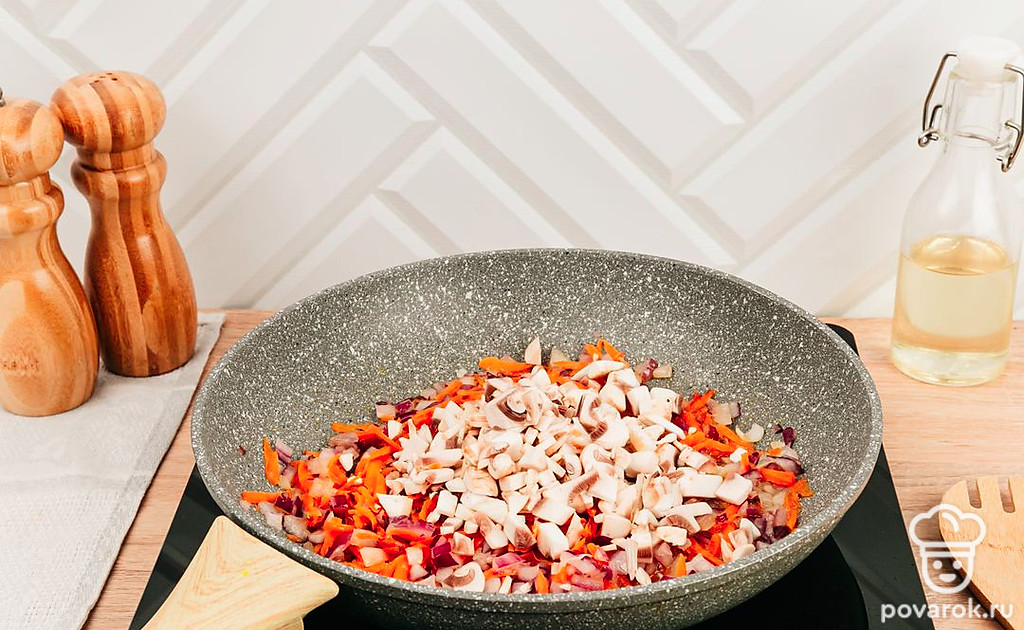 Разогрейте сковороду с растительным маслом. Обжарьте морковь и лук 5 минут, затем добавьте грибы. Жарьте все вместе в течение 10 минут.