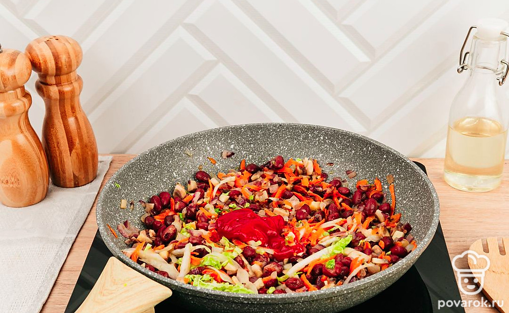 Добавьте в сковороду красную фасоль, пекинскую капусту и томатную пасту. Перемешайте. Готовьте еще немного до мягкости капусты.