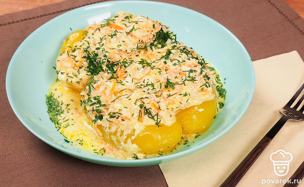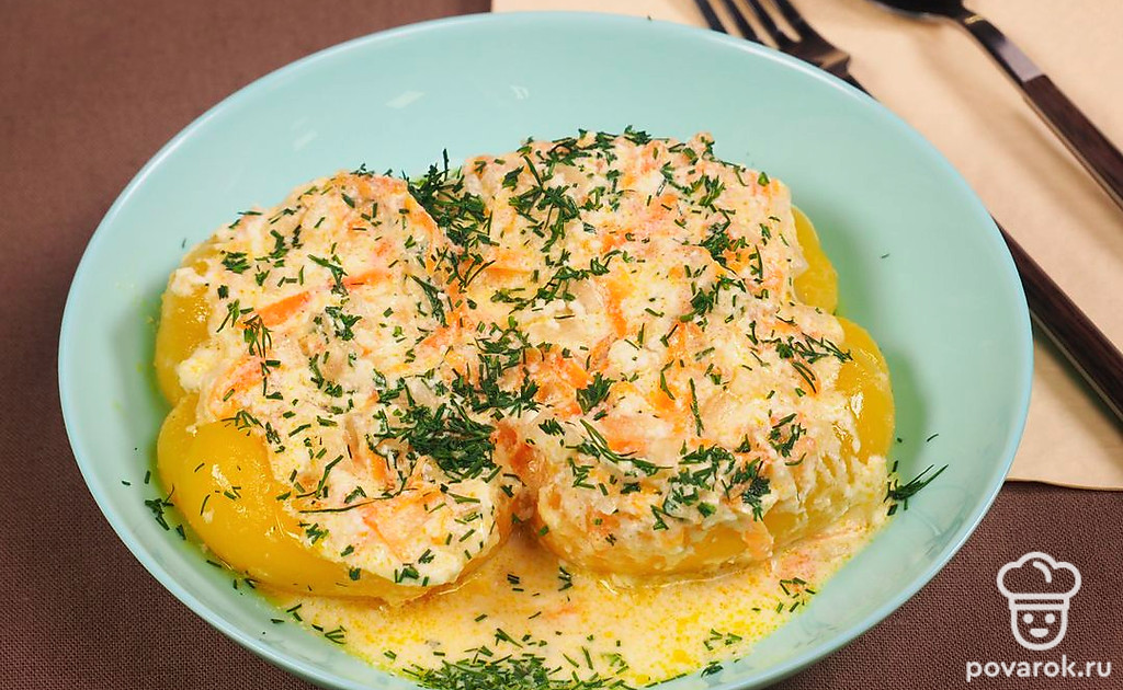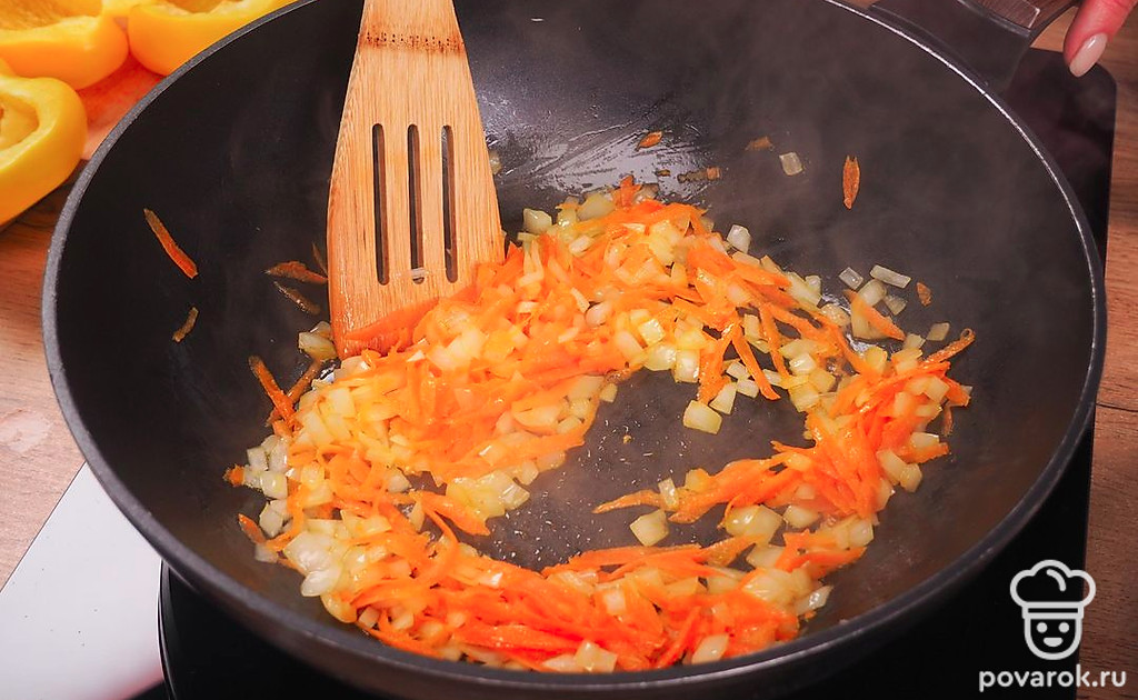 Подготовьте оставшиеся продукты и потушите перцы. Разогрейте сковороду с растительным маслом и обжарьте на ней лук и морковь в течение 5 минут. Добавьте к ним сметану и тщательно перемешайте.