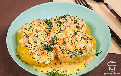 Готовые перцы выложите на порционные тарелки, полейте соусом, сверху посыпьте измельченной зеленью укропа.
