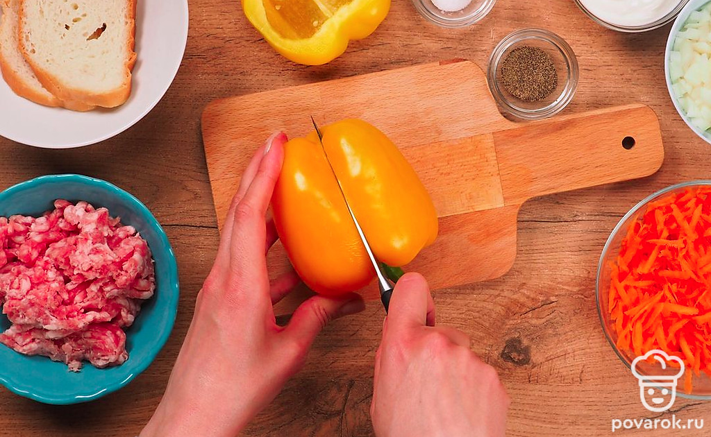 Промойте мясо и пропустите через мясорубку. Вымойте овощи, очистите лук и морковь, извлеките семена из перца. Мелко нарежьте лук, натрите морковь на терке. Разрежьте перцы пополам, если они крупные. Размочите хлеб в воде.