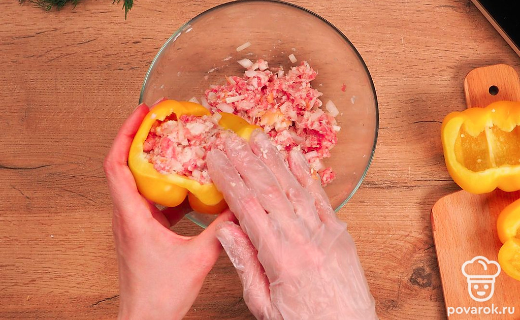 Приготовьте начинку и нафаршируйте перцы. В миску поместите мясной фарш. Лук добавьте к мясу вместе с размоченным хлебом. Посолите, поперчите и перемешайте. Перцы нафаршируйте начинкой.