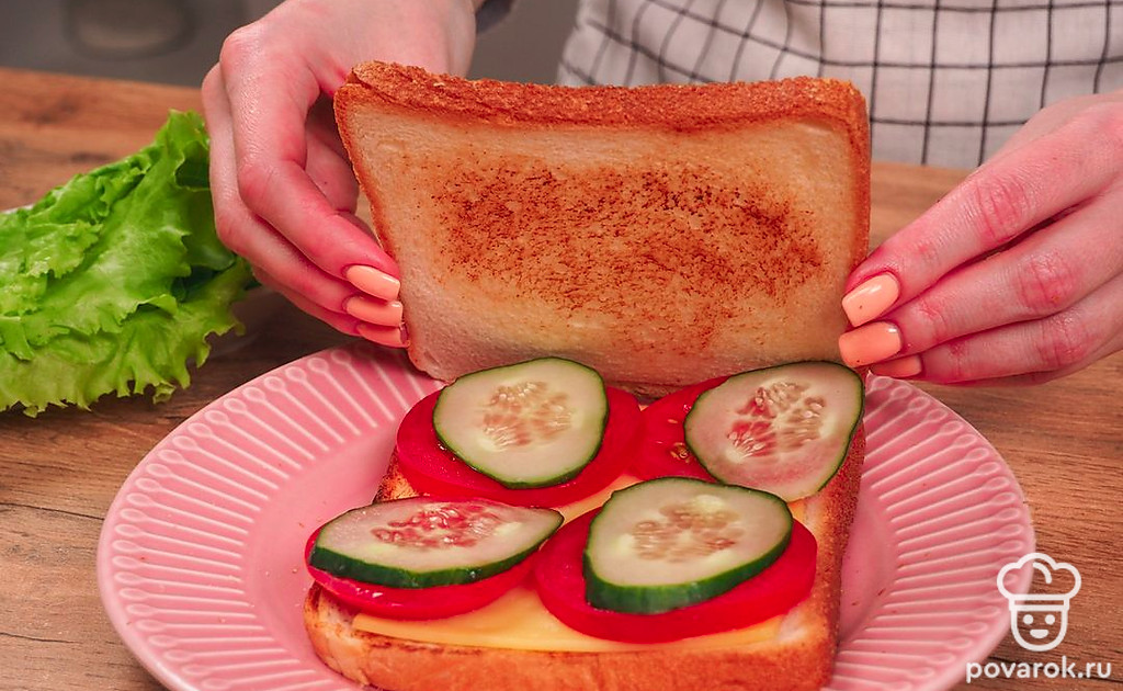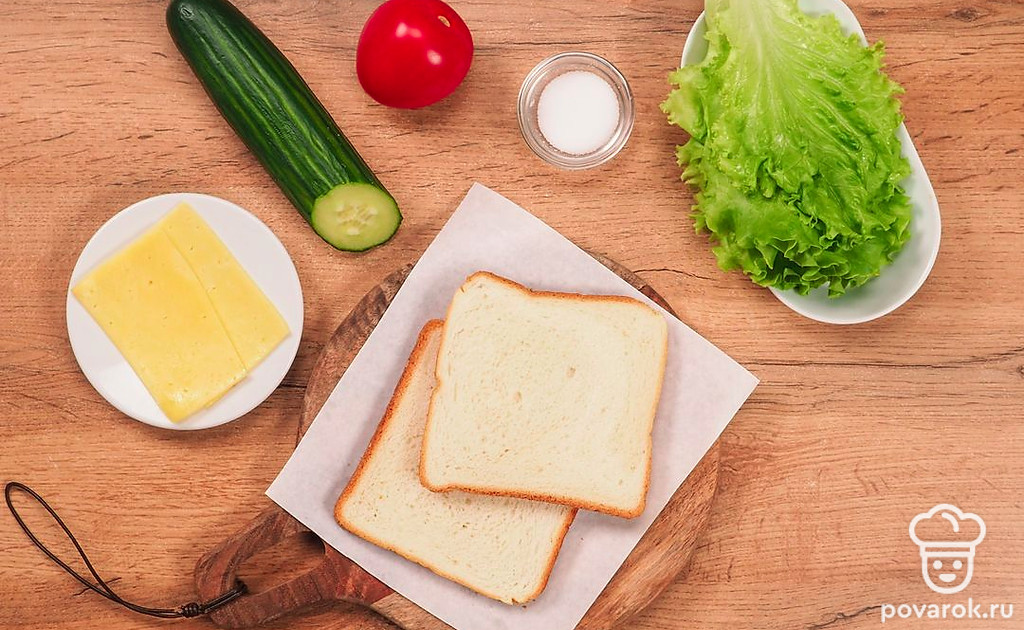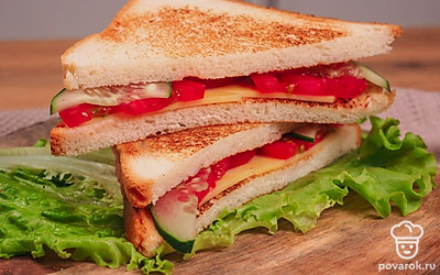 Соберите сэндвич. Для этого возьмите 1 ломтик хлеба, положите на него кусочки сыра, немного подсоленного помидора и свежий огурец. Сверху положите второй ломтик хлеба.