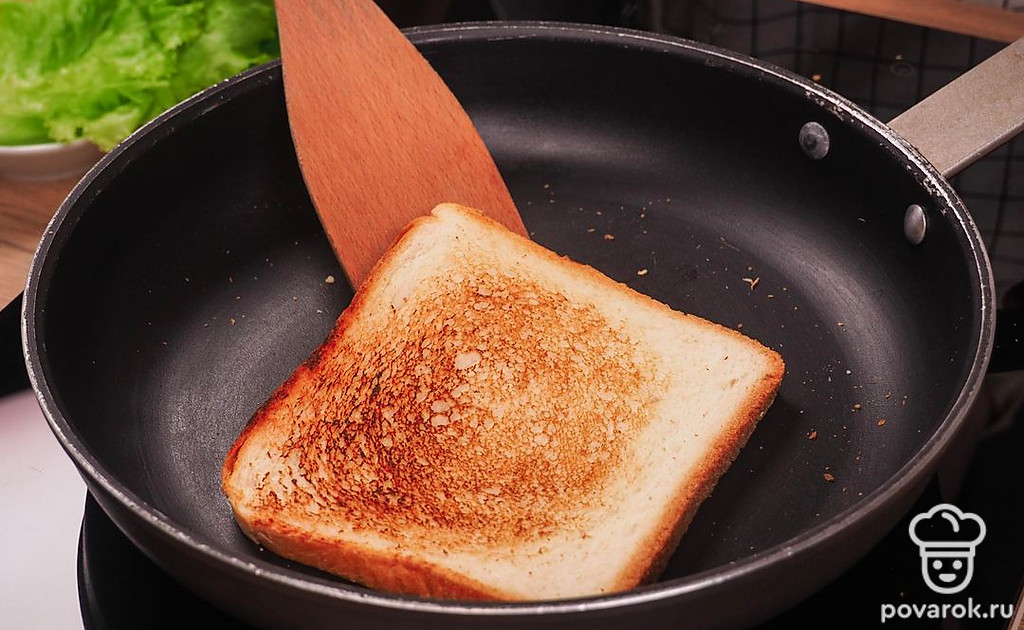 Подсушите хлеб. Для этого на разогретую сухую сковороду положите 2 ломтика хлеба и жарьте каждую сторону по 1 минуте.