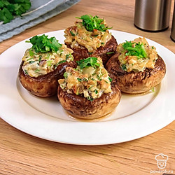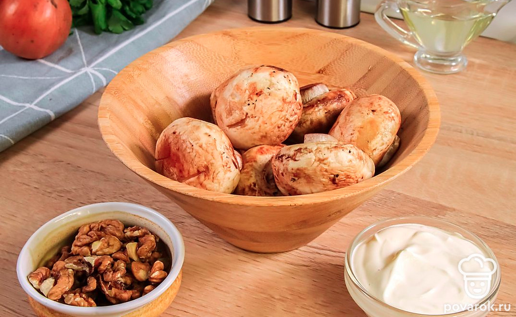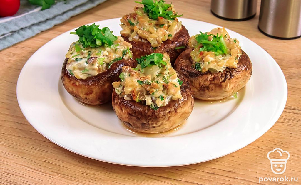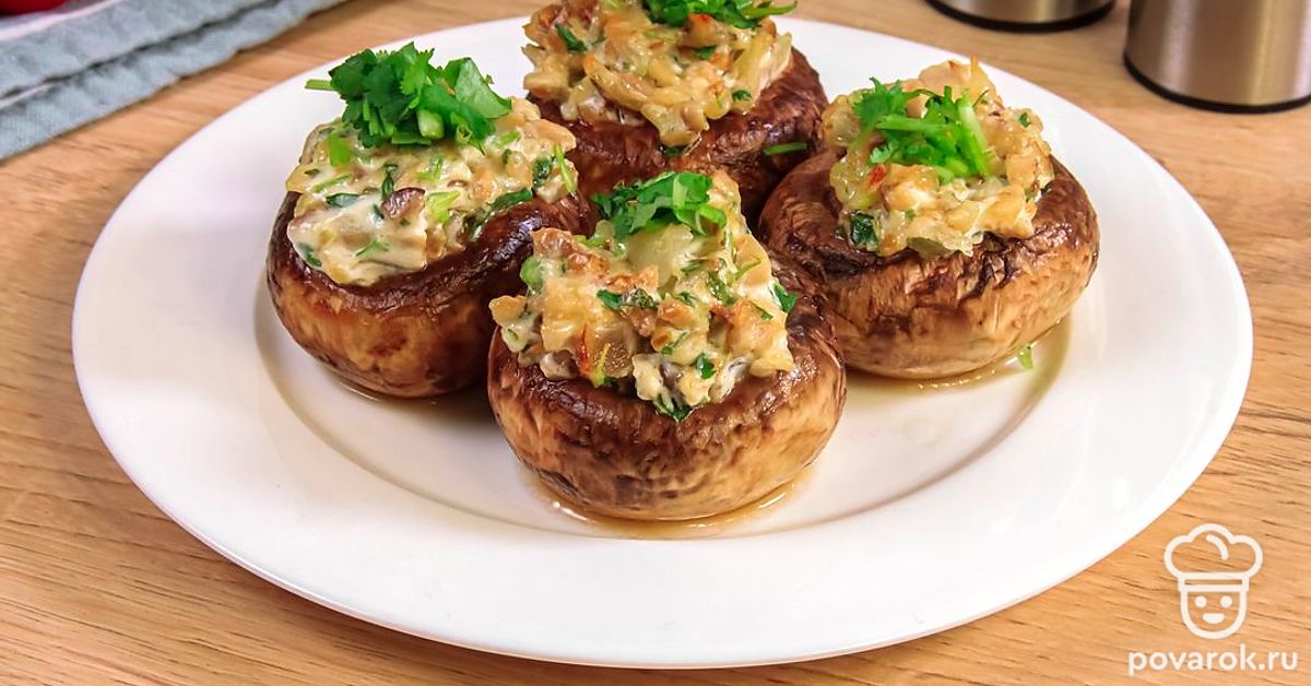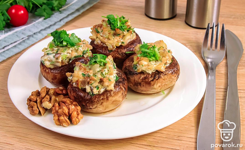 Шампиньоны, фаршированные грецким орехом и жареным луком, в сметанном соусе с зеленью — изысканная и легкая закуска, которая отлично подойдет для праздничного стола или фуршета. Для ее приготовления лучше всего взять крупные шампиньоны, их шляпки удобнее начинять. А если заменить сметану на кокосовое или миндальное молоко, то блюдо станет вегетарианским.