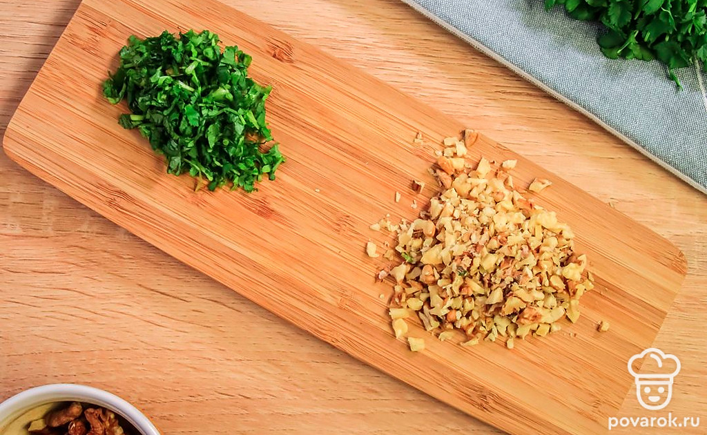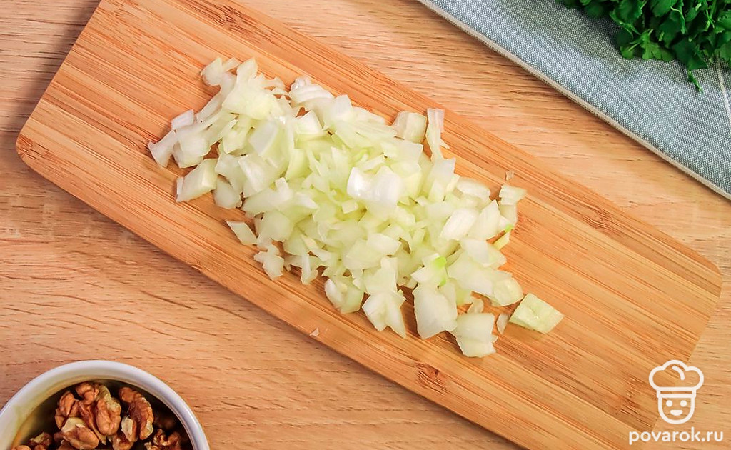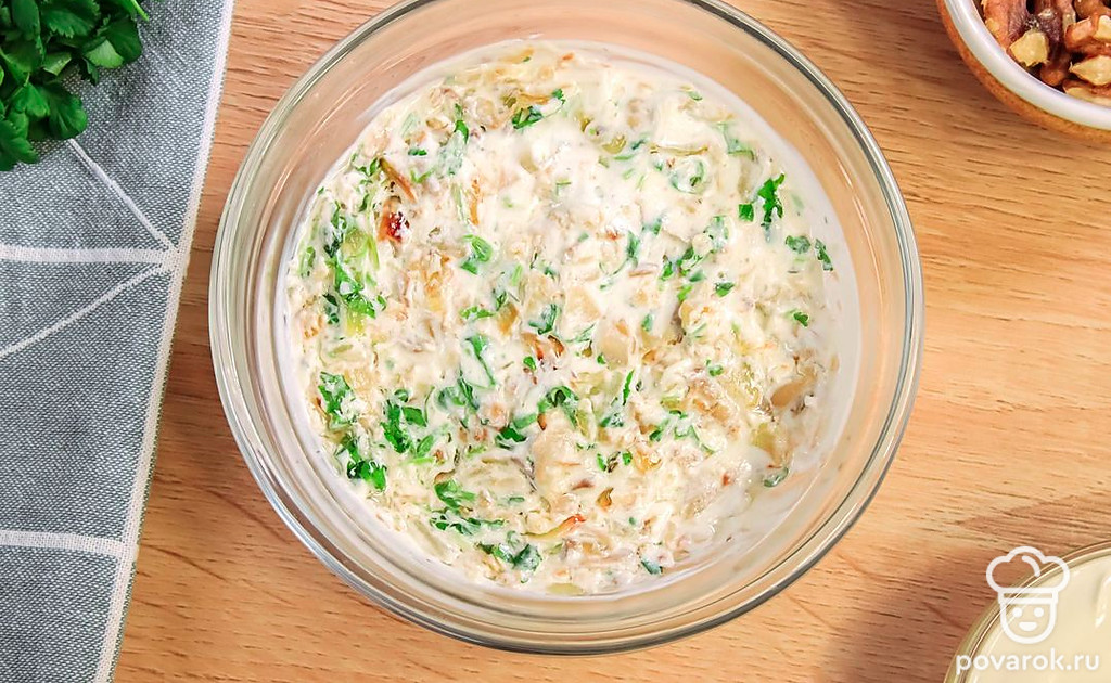 В глубокой миске смешайте обжаренный лук с грибами, орехи, петрушку и сметану. Посолите, поперчите и перемешайте начинку.