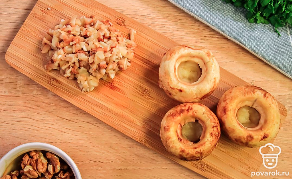 Отделите у шампиньонов ножки от шляпок. Ножки мелко порубите.