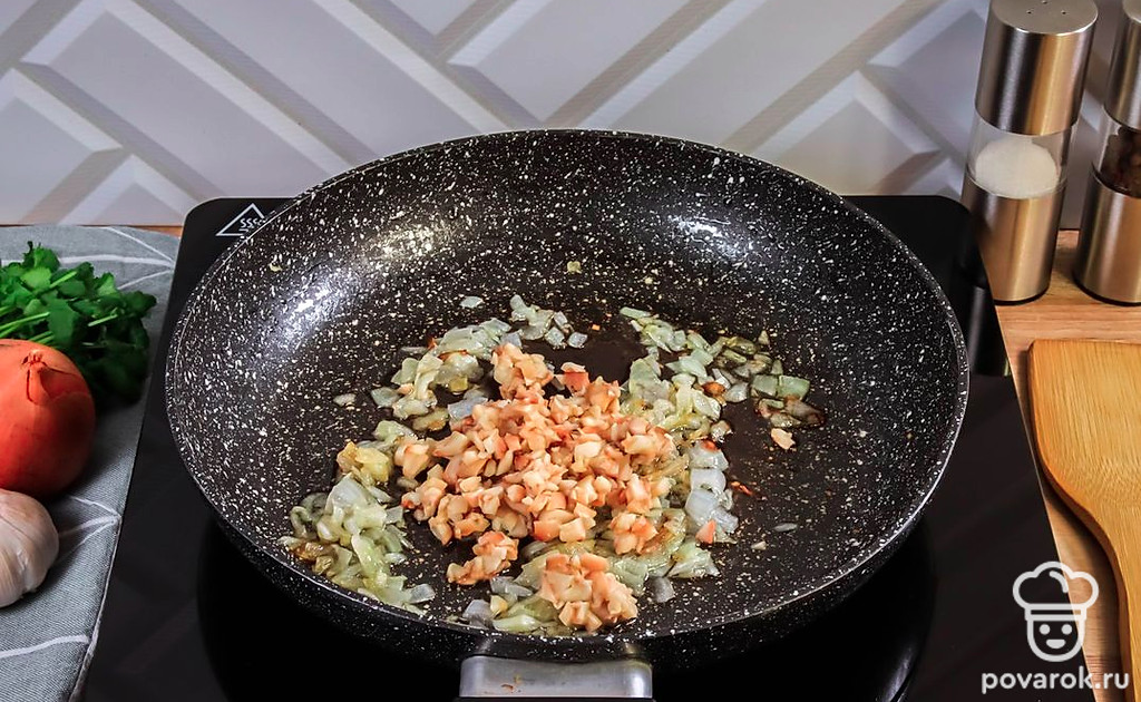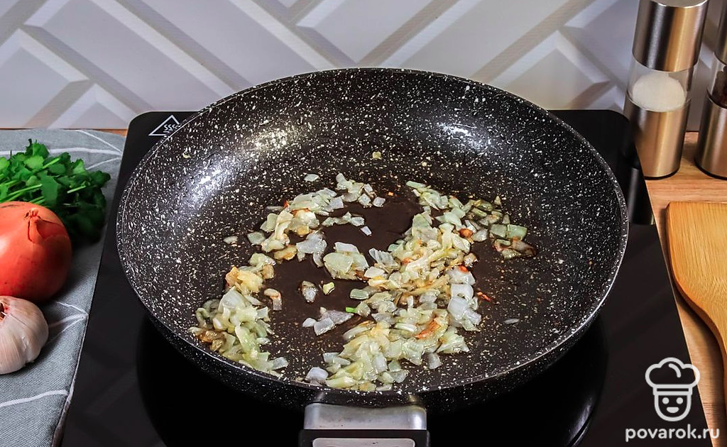 Разогрейте сковороду и влейте растительное масло. Обжарьте на среднем огне репчатый лук до золотистого цвета.