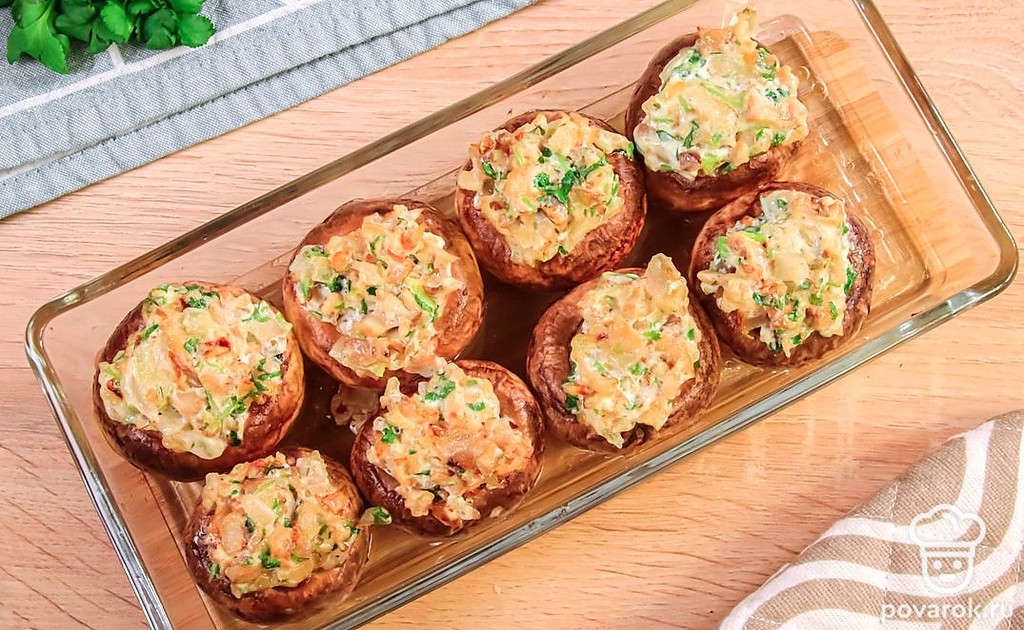 Смажьте форму для запекания растительным маслом, выложите шляпки шампиньонов и заполните начинкой.