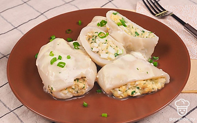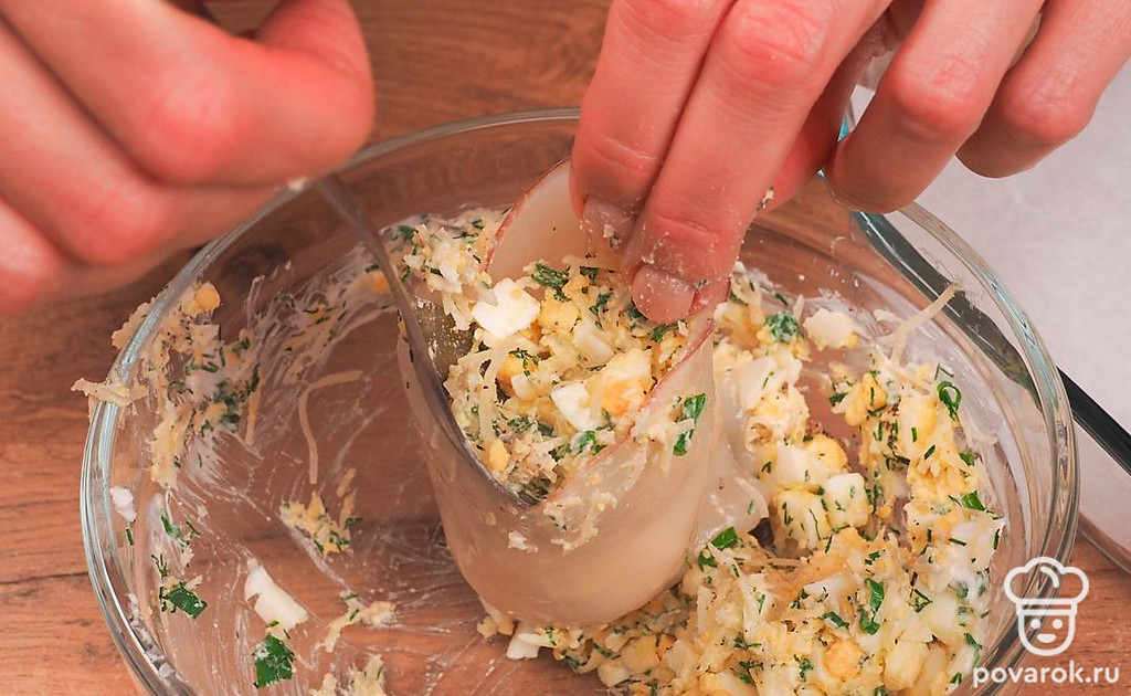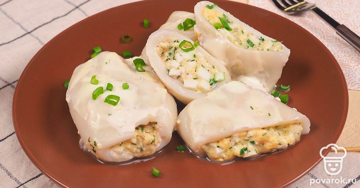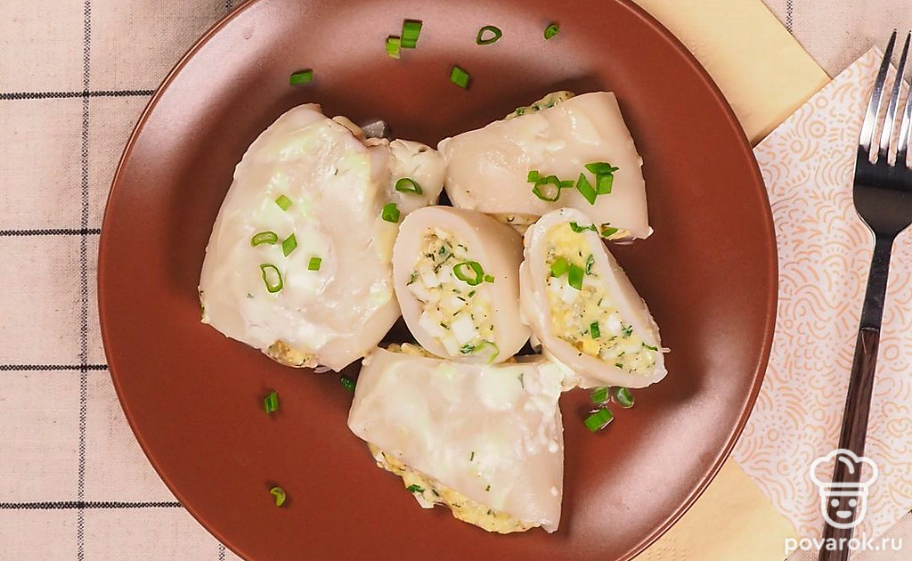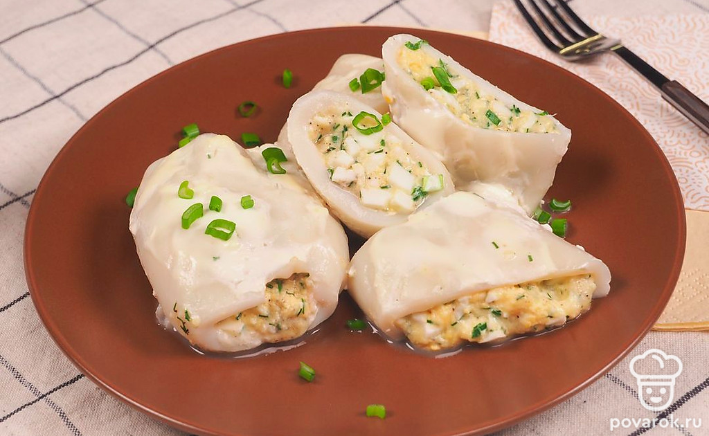 Фаршированный кальмар не только вкусное, но и полезное блюдо. Начинку можно сделать любой: с сыром, с грибами, с овощами, с яйцом или использовать сразу все ингредиенты. Чтобы блюдо, получилось вкусным, нужно выбрать свежий кальмар. Обращайте внимание на цвет мяса под его кожицей: оно должно быть светло-кремового, но не белого оттенка. Свежий кальмар имеет легкий рыбный запах, на кожице отсутствуют вмятины и пятна.