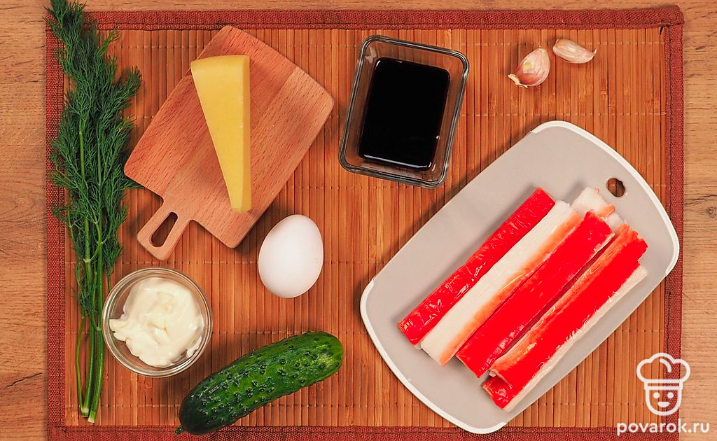 Вымойте укроп. Отварите яйца вкрутую и очистите их. Выложите все ингредиенты на видное место. Приготовьте терку, посуду для смешивания начинки. Разморозьте крабовые палочки, они обязательно должны быть мягкими. Чтобы крабовые палочки быстрее стали мягкими, можно опустить их в горячую воду. Очистите чеснок. Помойте огурец