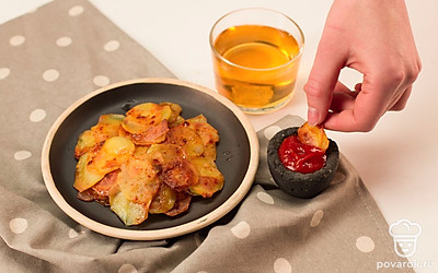 Подготовленный картофель выложите на противень, присыпьте солью, паприкой и сбрызните оливковым маслом.