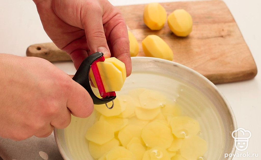 Нарежьте картофель слайсами и поместите в холодную воду на 3 минуты. Для нарезки картофеля используйте овощерезку. Затем слейте воду, выложите слайсы картофеля на бумажные полотенца и хорошенько просушите. Разогрейте духовку до 180°C.