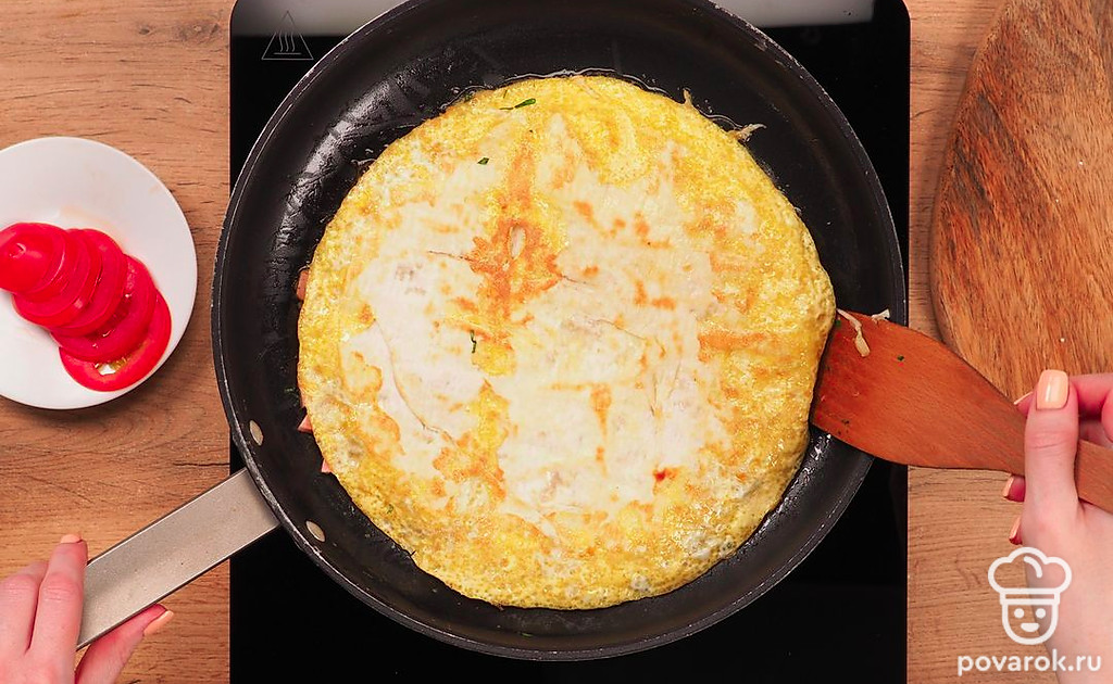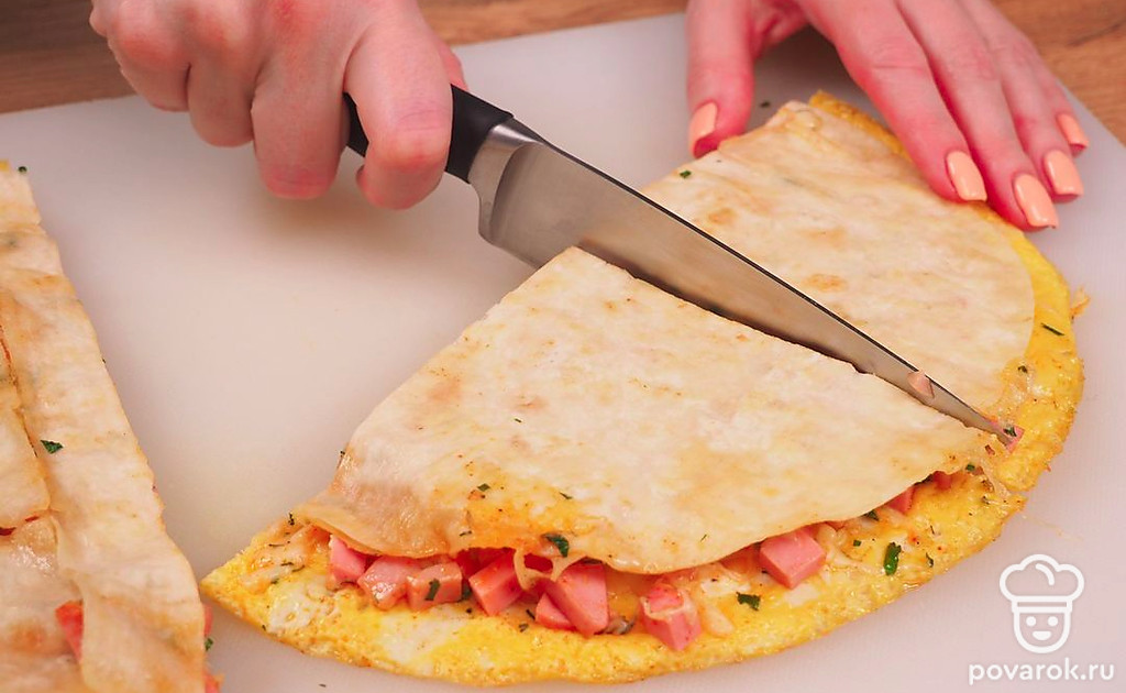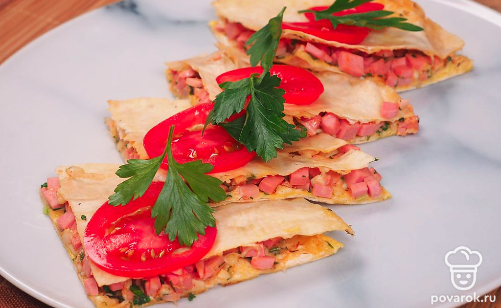 Переверните лаваш широкой лопаткой на другую сторону, накройте сковороду крышкой и оставьте блюдо на огне примерно на 2 минуты до тех пор, пока не расплавится сыр в начинке.