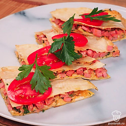 Выложите на сковороду первый лаваш и вылейте на него взбитые яйца. Через полминуты, когда яичная смесь немного схватится, выложите на яичный слой подготовленную начинку и равномерно распределите ее. Накройте вторым лавашем и смажьте его сверху растопленным маслом при помощи кисточки.