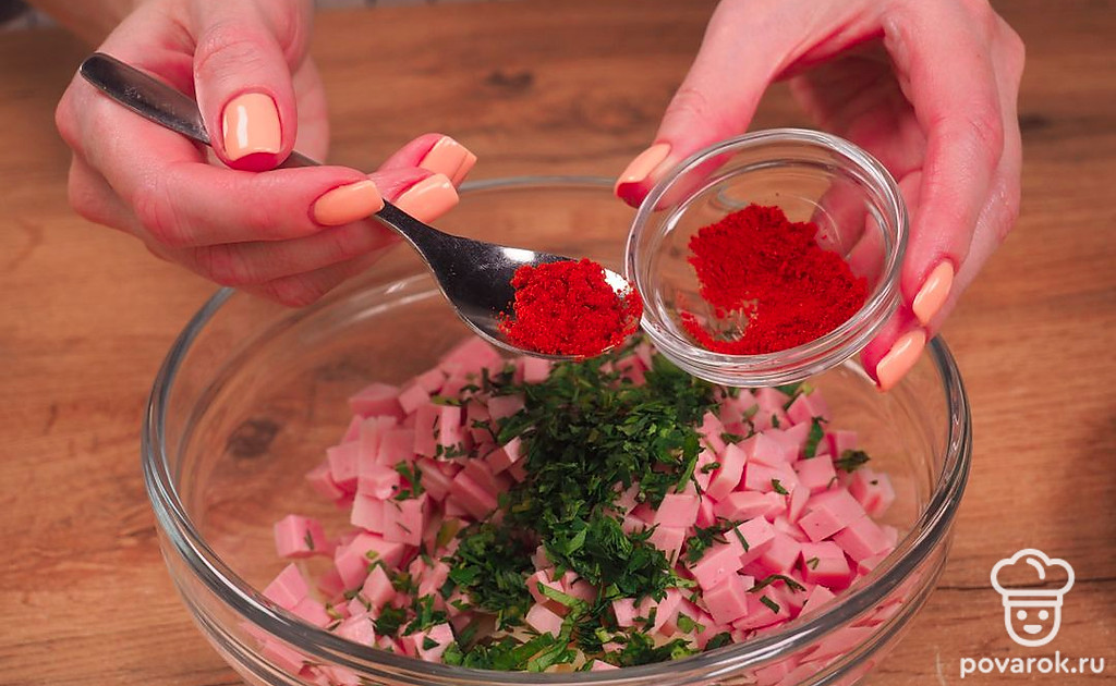 Приготовьте начинку: в миске смешайте нарезанную колбасу, натертый сыр, зелень, добавьте паприку, соль, перец и перемешайте ингредиенты.