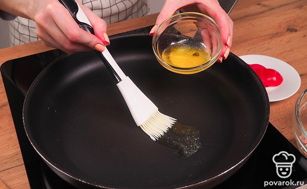 Поставьте сковороду на средний огонь, смажьте ее растопленным сливочным маслом при помощи кулинарной кисточки.