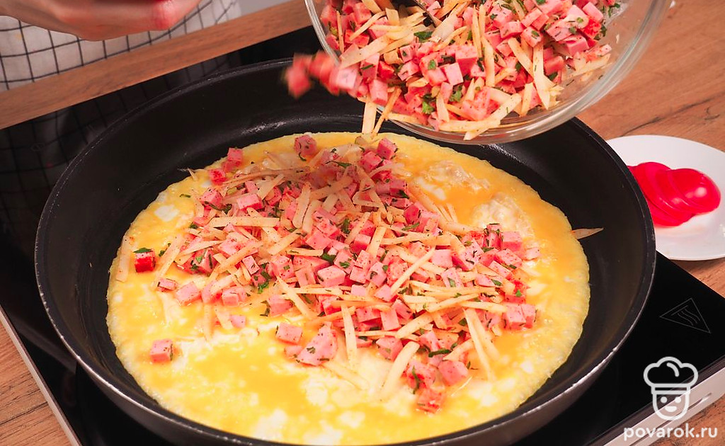 Чтобы сделать блюдо более полезным, вместо колбасных изделий используйте отварное мясо курицы.