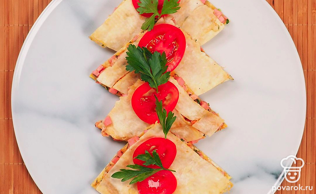 Украсьте готовое блюдо перед подачей: разложите нарезанные куски на широком блюде, положите на каждый кусочек по кружочку помидора и украсьте веточками укропа или петрушки.