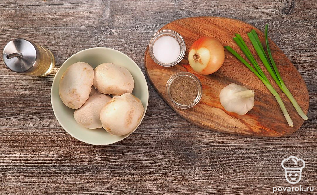 Удобно разложите все ингредиенты. Помойте шампиньоны. Лук и чеснок очистите от шелухи.