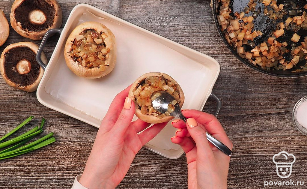 Приготовьте шампиньоны. Измельчите лук и чеснок. Обжарьте чеснок и лук на сковороде 1 минуту. Отрежьте ножки грибов и измельчите их. Шапочки оставьте целыми. Когда лук размягчится, добавьте к нему измельченные ножки грибов. Посолите и поперчите. Обжарьте пару минут. Разогрейте духовку до 180 градусов. Противень застелите пергаментом. В каждую шляпку гриба положите начинку, обжаренную на сковороде. Выложите начиненные шляпки на противень и запеките в духовке 20 минут.
