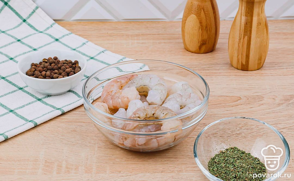 В глубокую кастрюлю добавьте 1 литр воды, добавьте перец и приправы, доведите воду до кипения и положите туда креветки, варите 6 минут.