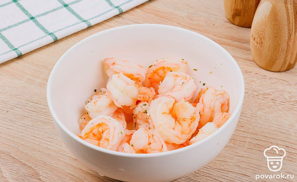 Переложите готовые креветки в глубокую миску, чтобы они остыли.