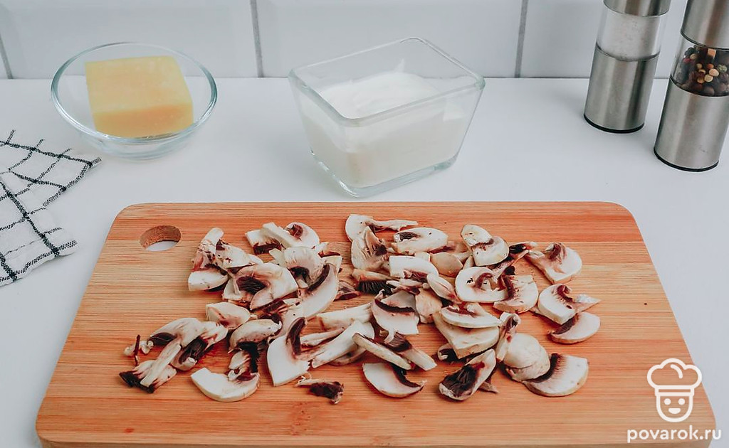 Шампиньоны разрежьте пополам и нарежьте слайсами.