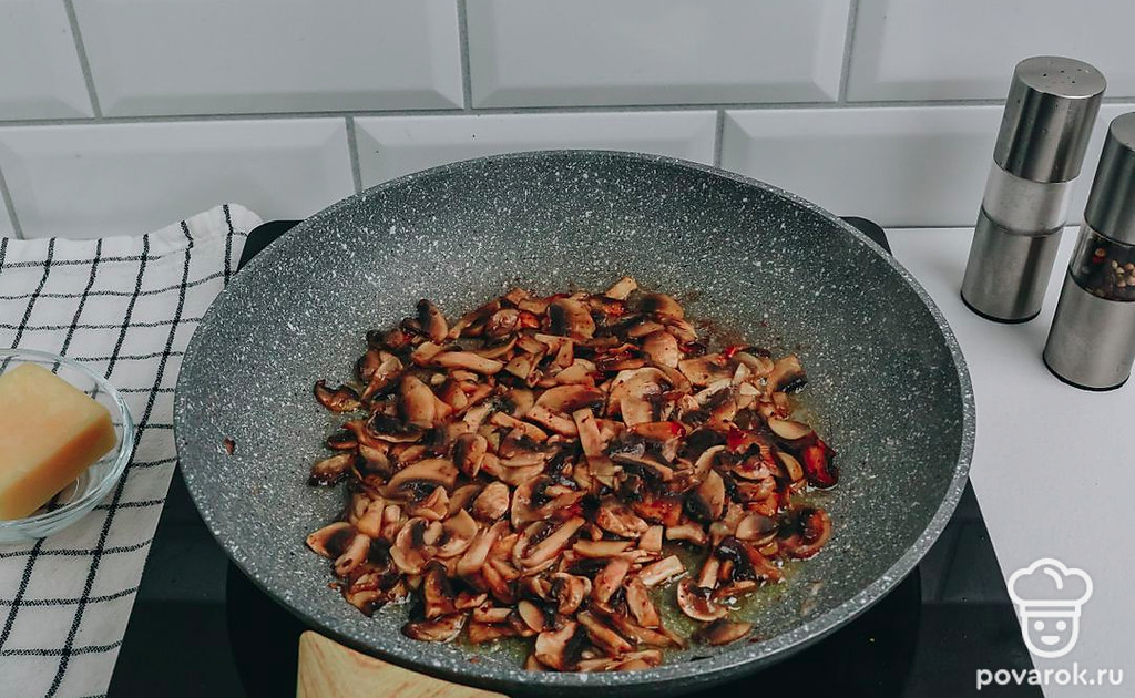На разогретой с растительным маслом сковороде обжарьте шампиньоны до полуготовности в течение 5-7 минут.