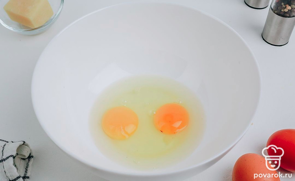 В миску разбейте яйца, взбейте с помощью венчика или вилки до однородности.
