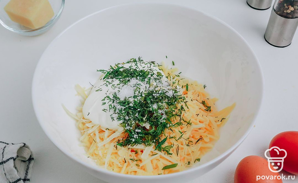 К яйцам добавьте сыр, сметану и мелко нарубленный укроп.