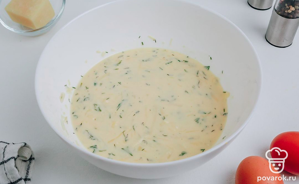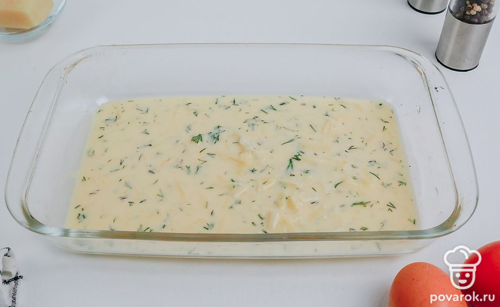 В форму для запекания первым слоем вылейте половину яичной заливки.