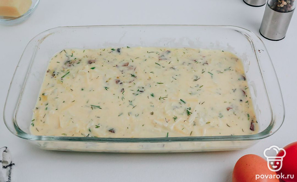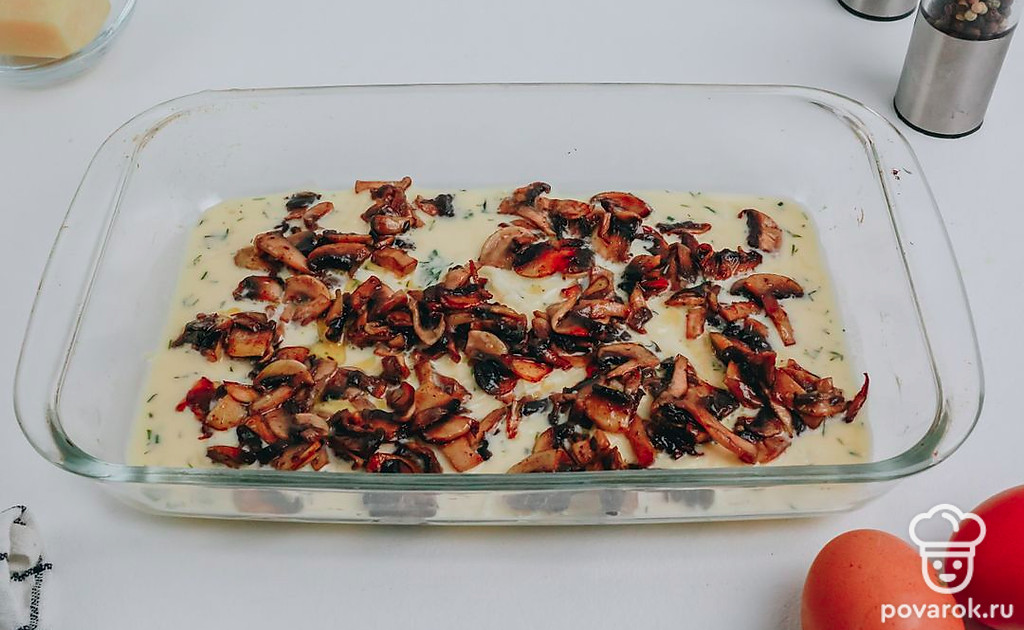 Залейте грибы оставшейся заливкой и отправляйте в предварительно разогретую до 180 °C духовку на 35 минут.