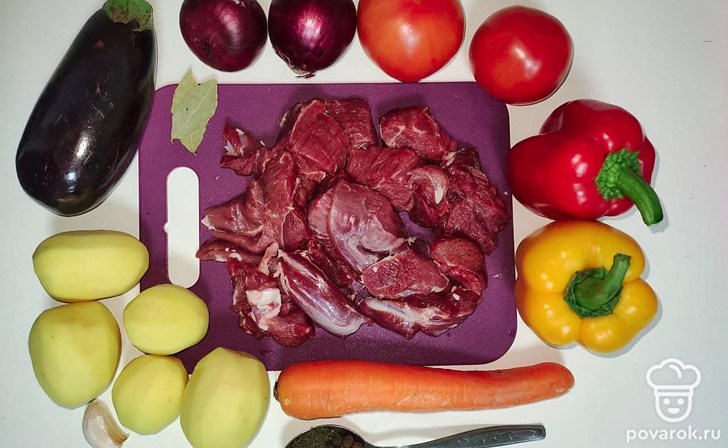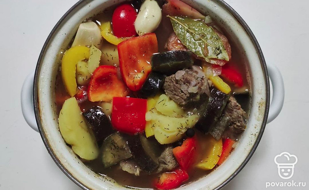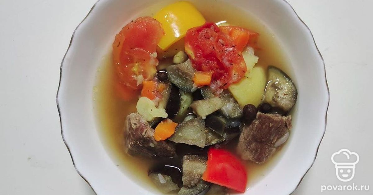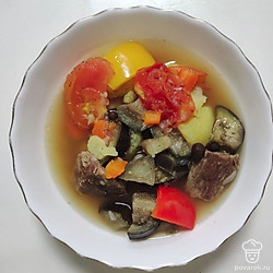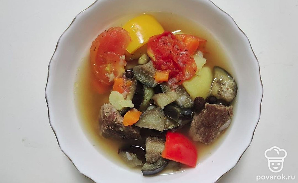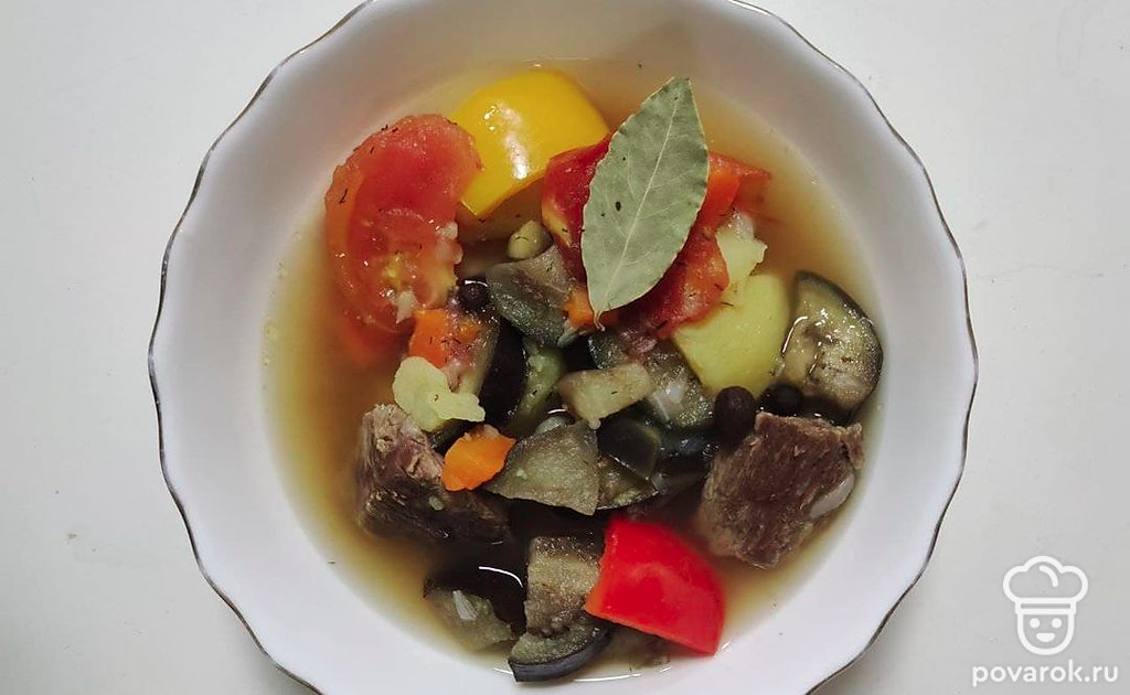 Шурпа с баклажанами и ароматом чеснока — изысканное ароматное блюдо, необычайно интересное и сравнительно недорогое. Характерной особенностью приготовления шурпы являются крупно нарезанные овощи. Благодаря баранине, суп получается жирным, наваристым, очень сытным и вкусным, поэтому его стоит добавить в рацион людям, занимающимся тяжелым физическим и умственным трудом. Его можно подавать как суп или разделить на первое (бульон) и второе (мясо с гарниром).