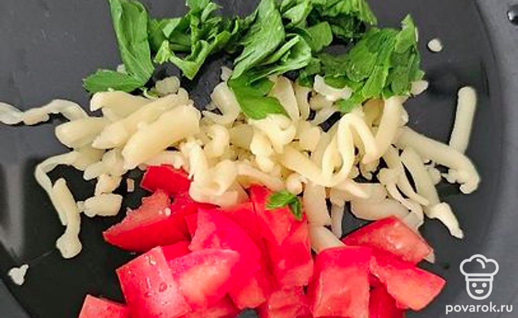 Нарежьте зелень, помидор и еще немного сыра. Добавьте майонез и хорошо перемешайте.