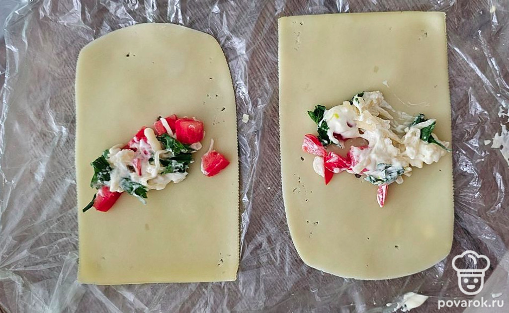 На сыр посередине выложите начинку.