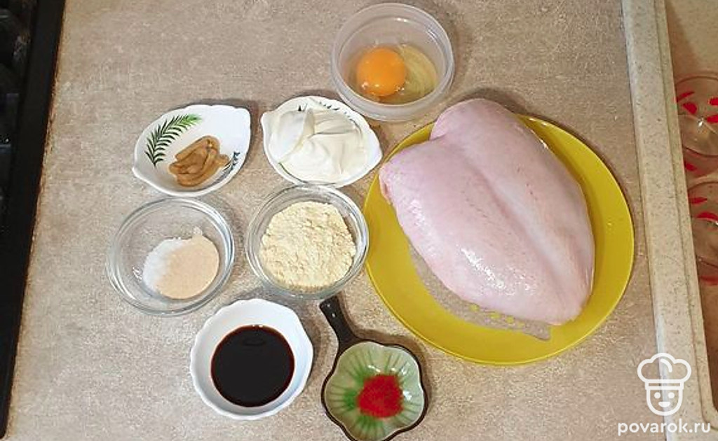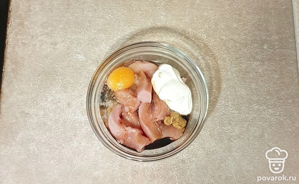 Филе выложите в глубокую миску, добавьте яйцо, соевый соус, сметану, горчицу, паприку и слегка посолите. Хорошо перемешайте. Оставьте при комнатной температуре примерно на 1 час, чтобы курица промариновалась.