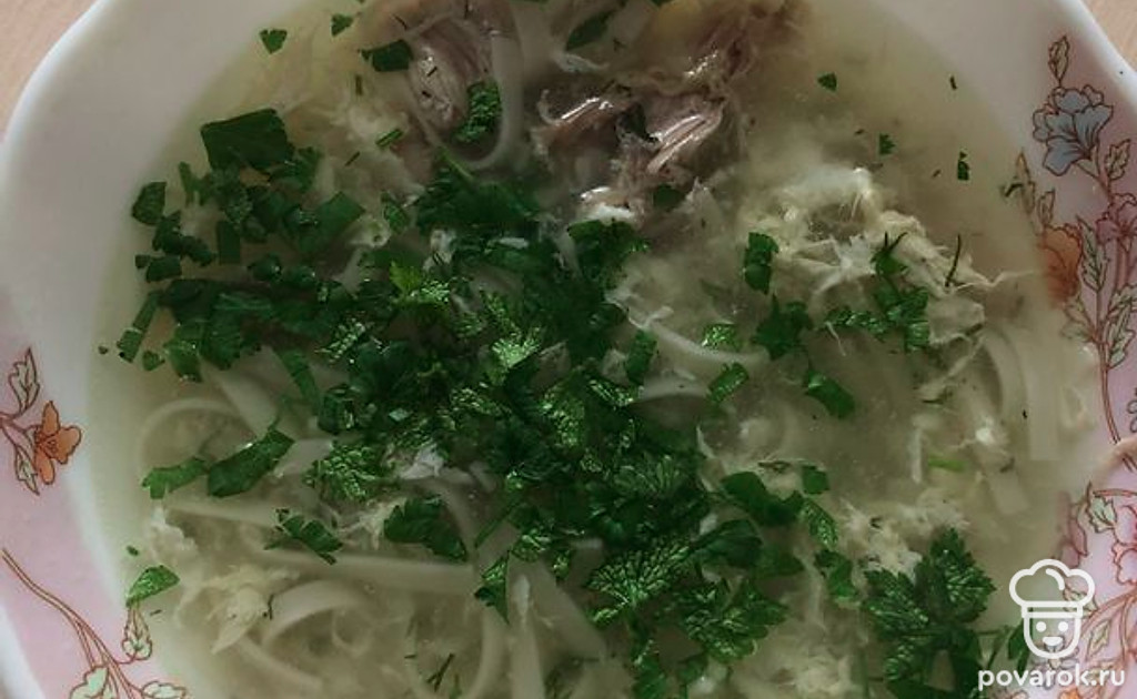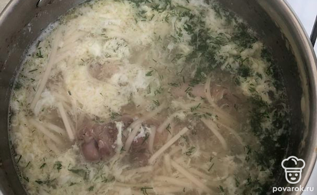Яйцо взбейте в кружке вилкой и постепенно влейте его в суп, продолжая активно помешивать бульон. Тогда яйцо образует своеобразные «кудряшки».