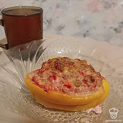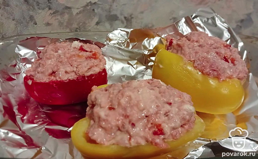 Начините получившимся фаршем перцы. Выложите их на фольгу и запекайте в разогретой до 180 градусов духовке 45 минут.